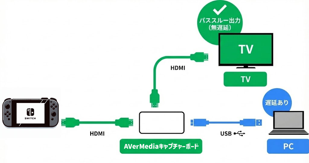 パススルー機能とは、キャプチャーボードに入力された映像を、遅延なくそのままモニターに出力する機能のことです。キャプチャーボードを経由してパソコンに映像を取り込む際には、どうしても処理による遅延(ラグ)が発生します。この遅延があると、ゲームの操作感が悪くなり、特にアクションゲームやFPSでは致命的な問題になってしまいます。