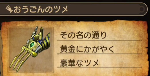 序盤で最も攻撃力が高い武器の一つが「黄金の爪」です。ムーンペタの福引で特等景品として手に入るこの武器は、序盤としては破格の攻撃力を誇ります。