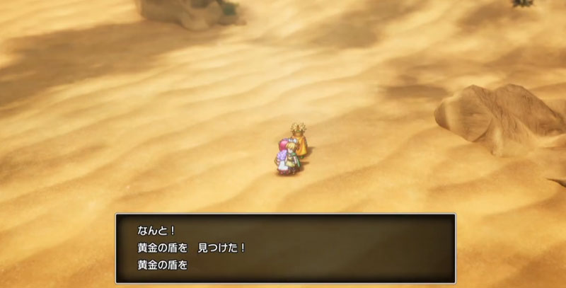 序盤の防具で特に優秀なのが「黄金の盾」です。オアシス東側の秘密の場所で拾うことができますが、レミラーマがないと見つけにくい場所にあります。