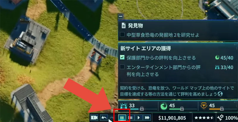 特に恐竜を麻酔で眠らせたいときや、囲いを拡張したいときは停止モードが大活躍します。動いている恐竜を追いかける必要がないので、作業効率が格段に上がります。