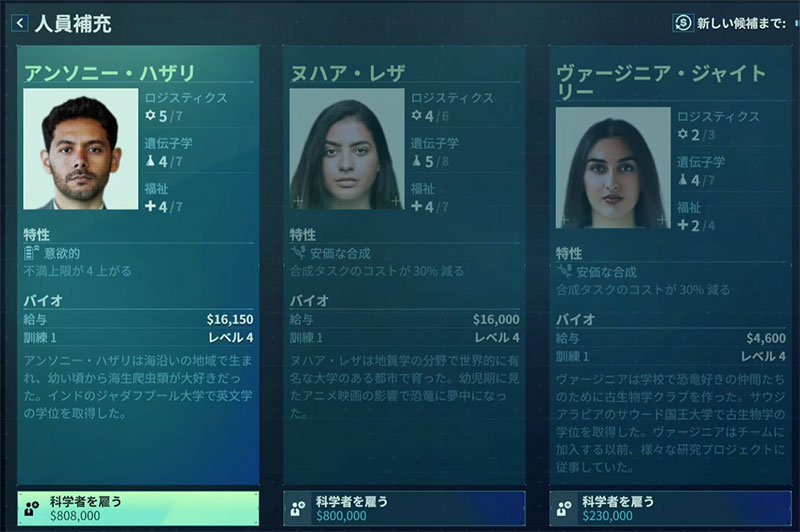 科学者にはロジスティクス、遺伝子操作、福祉などの能力値があり、それぞれ得意分野が違います。給料は能力に応じて変わりますが、高給取りでも能力が高い科学者は積極的に雇用する価値があります。